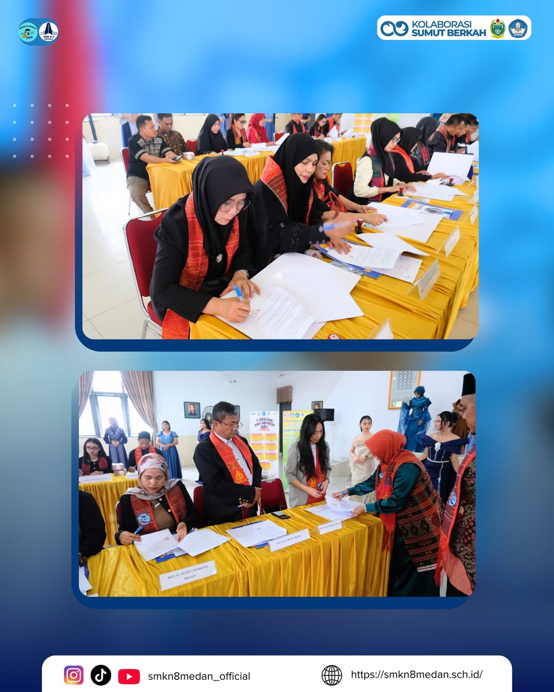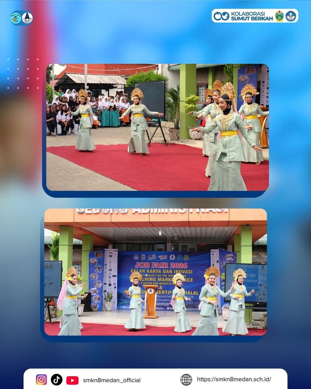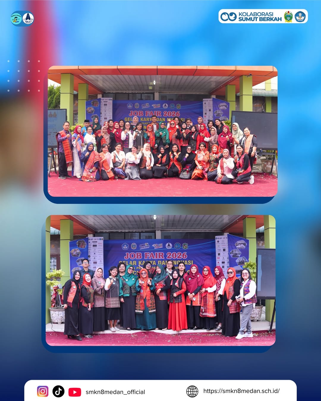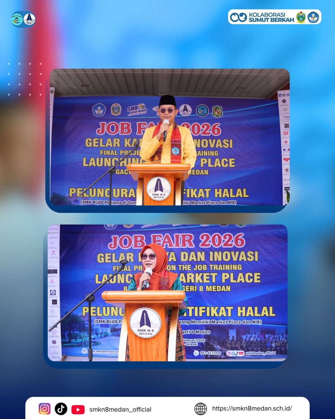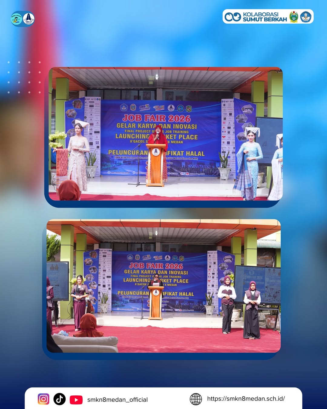 SMK Negeri 8 Medan sukses menyelenggarakan Job Fair 2026, Penguatan Kemitraan & Peluncuran Sertifikat Halal pada 12 Februari 2026. Kegiatan ini menjadi wujud nyata sinergi antara dunia pendidikan dan dunia industri melalui penandatanganan kerja sama, penyediaan peluang kerja bagi lulusan, serta penguatan program link and match. Selain itu, dilaksanakan pula Gelar Karya Inovasi On The Job Training (OJT) yang menampilkan kreativitas dan kompetensi peserta didik sesuai bidang keahlian. Pada kesempatan yang sama, SMK Negeri 8 Medan juga meluncurkan sertifikat halal produk siswa serta launching marketplace sebagai langkah strategis mendorong kewirausahaan dan kesiapan lulusan menghadapi dunia kerja dan dunia usaha. Melalui kegiatan ini diharapkan lulusan SMK Negeri 8 Medan semakin kompeten, profesional, serta mampu bersaing di tingkat industri maupun berwirausaha secara mandiri.