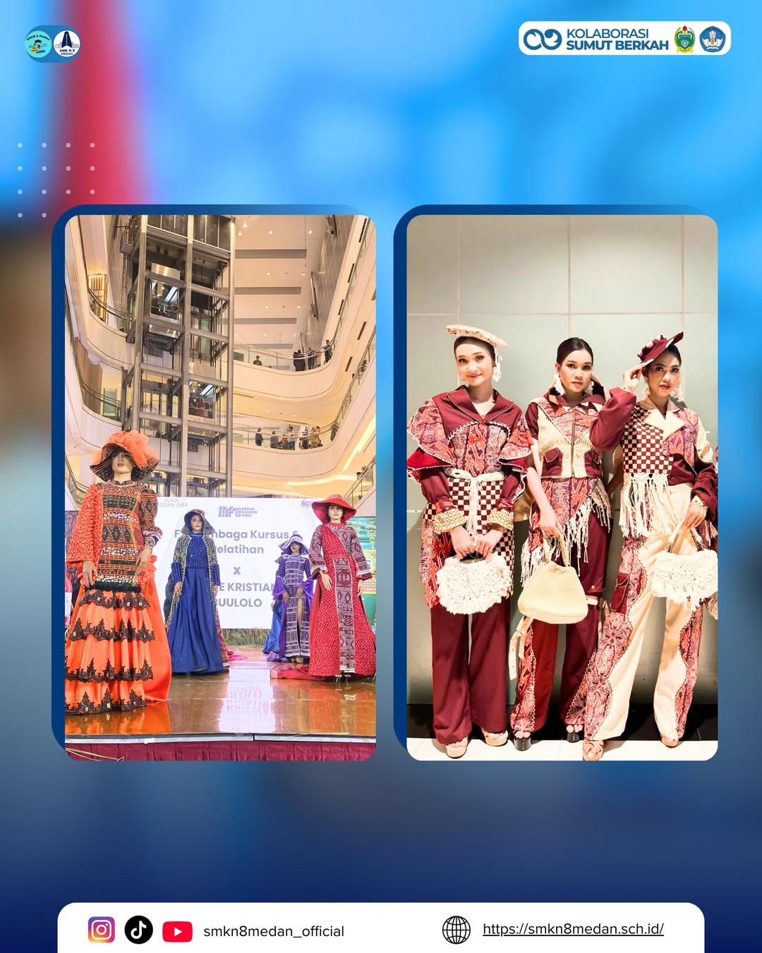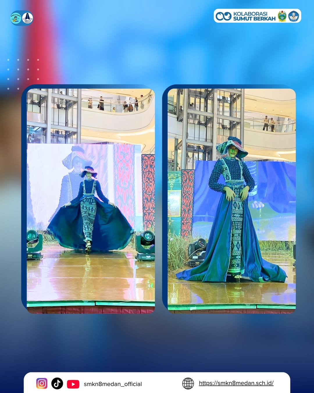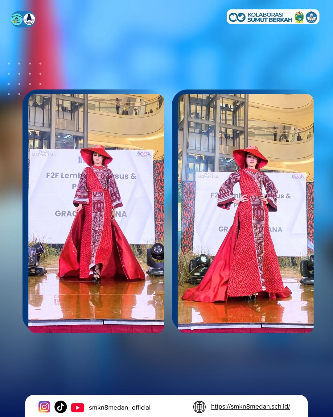 SMK Negeri 8 Medan kembali menorehkan prestasi membanggakan dalam ajang Medan Fashion Week 2026 yang diselenggarakan pada 15 Februari 2026 di Plaza Medan Fair. Melalui kolaborasi industri bersama Rumah Mode Wulan Gumilang, Arini Rumah Kebaya, dan Lembaga Kursus dan Pelatihan F2F, karya-karya terbaik siswa jurusan Busana SMK Negeri 8 Medan tampil memukau di atas panggung fashion bergengsi. Ajang ini menjadi bukti nyata sinergi antara dunia pendidikan vokasi dan industri kreatif dalam mencetak generasi muda yang kompeten, kreatif, dan siap bersaing. Partisipasi ini tidak hanya menjadi wadah unjuk karya, tetapi juga pengalaman berharga dalam membangun kepercayaan diri, profesionalisme, serta jejaring industri bagi para siswa. Prestasi dan apresiasi yang diraih menjadi motivasi untuk terus berkarya dan berinovasi. Terima kasih kepada seluruh pihak yang telah mendukung dan berkontribusi dalam kegiatan ini. Semoga kolaborasi dan langkah baik ini terus membawa SMK Negeri 8 Medan semakin maju dan berprestasi. SMK Bisa! SMK Hebat!