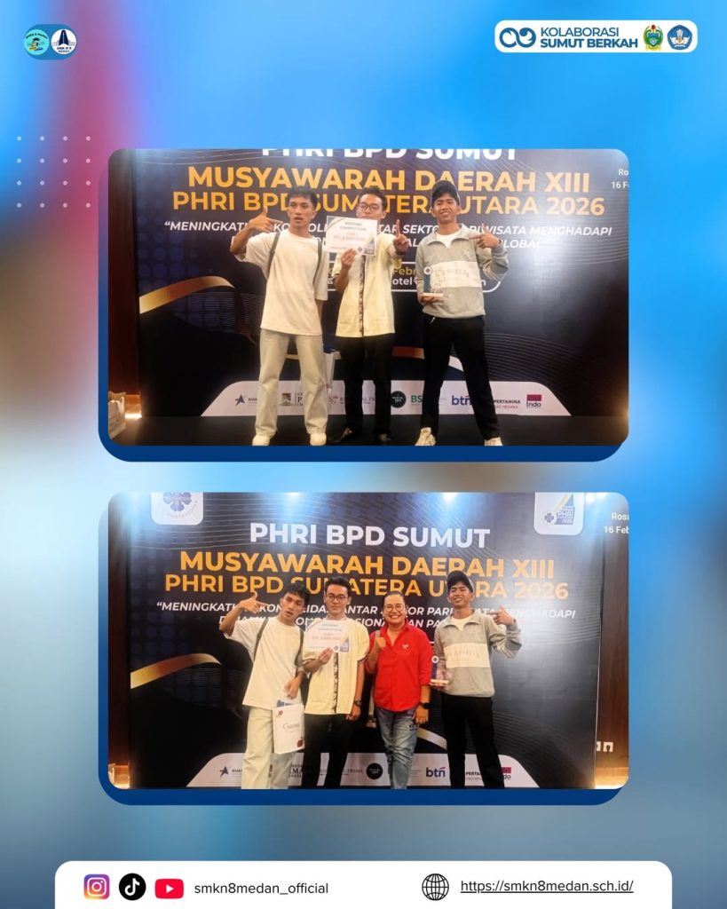 SMK Negeri 8 Medan kembali menorehkan prestasi membanggakan dalam ajang Public Speaking Medan Korea Center yang dilaksanakan pada 15 Februari 2026. Dalam kompetisi bergengsi ini, peserta didik SMK Negeri 8 Medan berhasil menunjukkan kemampuan terbaiknya. Lewivia Zenina Sitepu (XI Boga 1) berhasil meraih Juara 2, sementara Raihan Pramudya Alzaqi (XI PH 2) meraih Juara Harapan 1. Prestasi ini menjadi bukti bahwa siswa-siswi SMK Negeri 8 Medan tidak hanya unggul dalam keterampilan vokasi, tetapi juga memiliki kemampuan komunikasi dan public speaking yang kompetitif serta percaya diri di tingkat yang lebih luas. Terima kasih kepada seluruh pihak yang telah mendukung dan membimbing, baik guru pembina, orang tua, serta semua pihak yang turut memberikan doa dan semangat. Semoga prestasi ini menjadi motivasi untuk terus berkembang dan menginspirasi siswa lainnya.