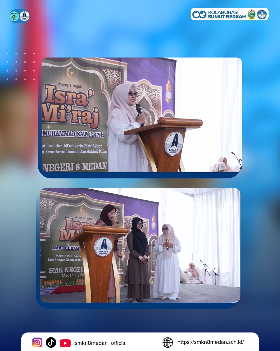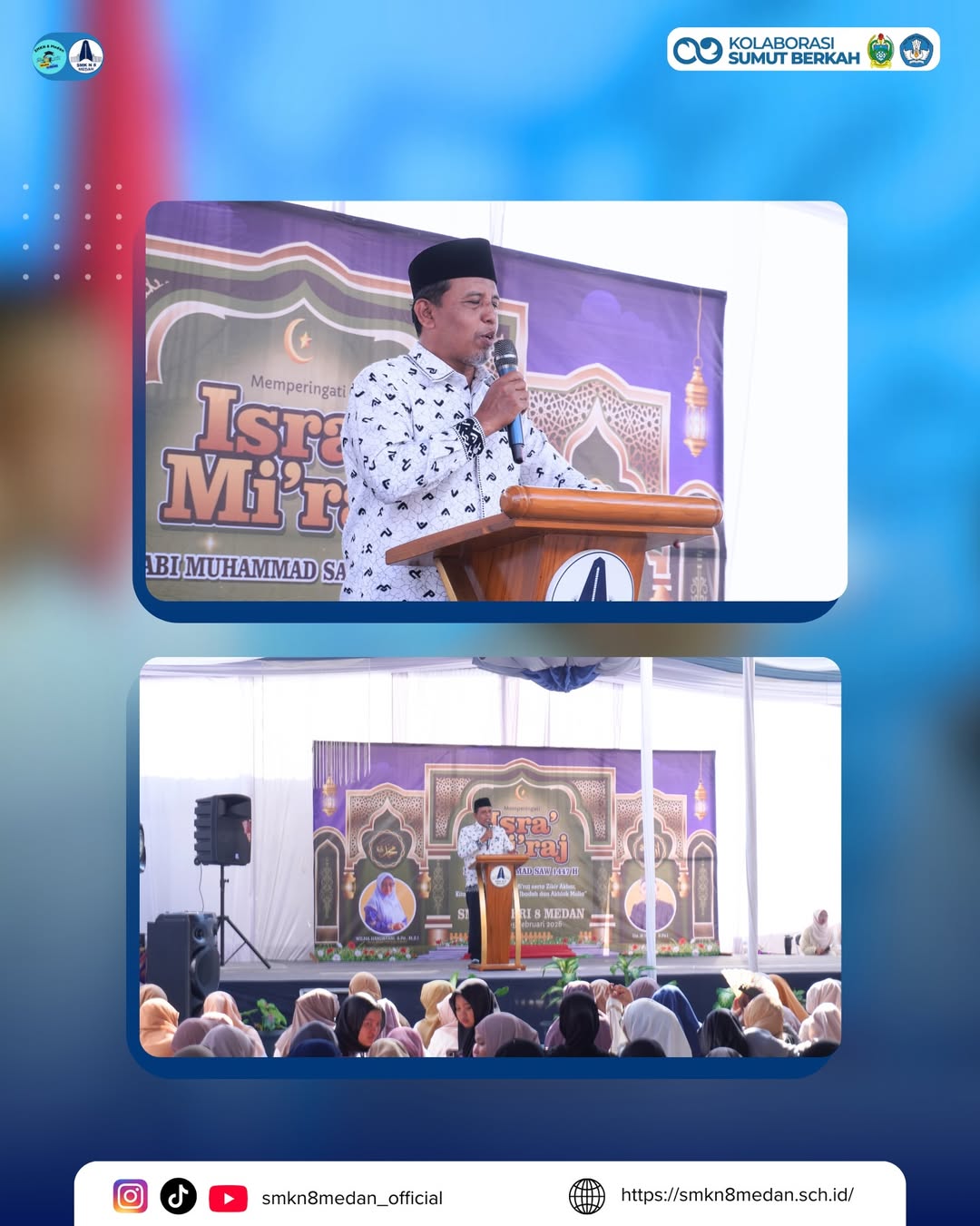 Dalam rangka memperingati Isra’ Mi’raj Nabi Muhammad SAW, SMK Negeri 8 Medan menyelenggarakan kegiatan keagamaan sebagai bentuk refleksi dan penguatan nilai-nilai keimanan bagi seluruh warga sekolah. Momentum 27 Rajab 1447 H. kegiatan ini di laksanakan pada 05 Februari 2026 ini dimaknai sebagai pengingat pentingnya meningkatkan kualitas ibadah, menumbuhkan akhlak mulia, serta memperkuat karakter peserta didik dalam kehidupan sehari-hari, khususnya di lingkungan pendidikan. Pada kesempatan ini, SMK Negeri 8 Medan turut mengundang beberapa tokoh masyarakat dan para ustaz untuk memberikan tausiyah dan pencerahan rohani, sehingga kegiatan ini tidak hanya menjadi seremonial, tetapi juga sarat dengan nilai edukatif dan spiritual. Melalui peringatan Isra’ Mi’raj ini, diharapkan dapat membawa keberkahan, mempererat silaturahmi, serta menjadi motivasi bersama dalam membangun generasi yang beriman, berilmu, dan berakhlak mulia.