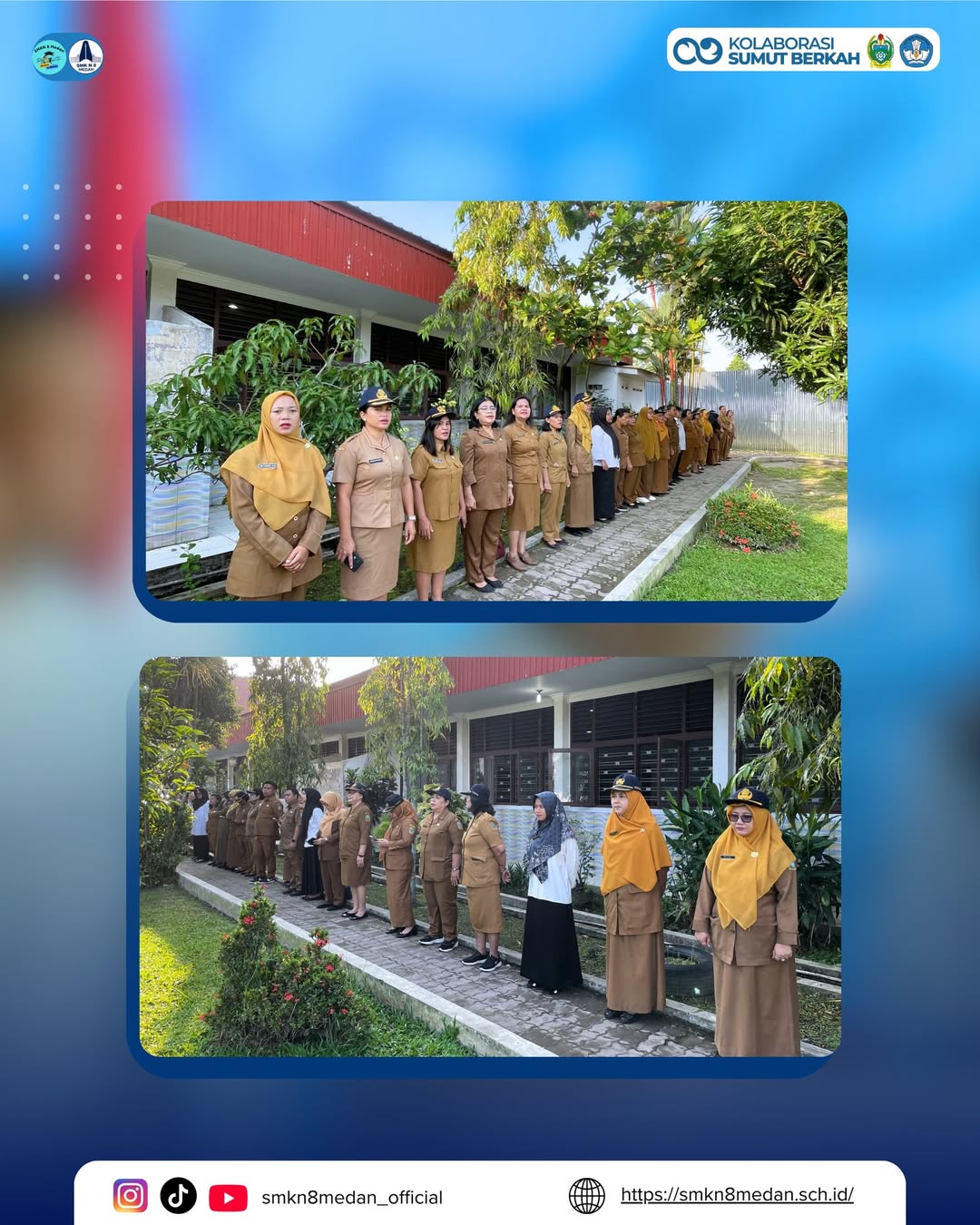 SMK Negeri 8 Medan melaksanakan Upacara Bendera rutin yang berlangsung dengan khidmat. Pada kesempatan ini, upacara dipimpin oleh Pembina Upacara Ibu Intan Amalia Tasya yang menyampaikan amanat bertema “Seni Kebiasaan Baik di Sekolah”. Materi tersebut menekankan pentingnya membangun budaya positif, disiplin, serta sikap saling menghargai sebagai fondasi karakter peserta didik.