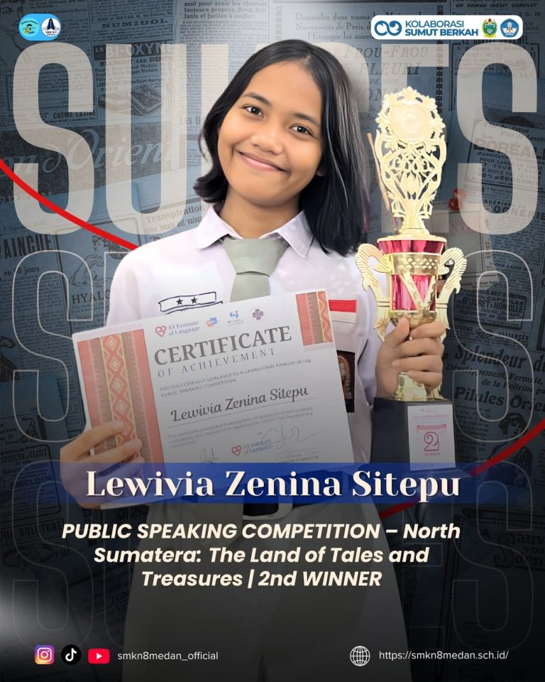 Prestasi membanggakan kembali diraih oleh siswa SMK Negeri 8 Medan. Lewivia Zenina Sitepu berhasil meraih juara 2 dalam ajang Public Speaking Competition bertajuk “North Sumatera: The Land of Tales and Treasures.”